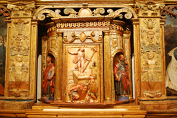 En el 1583 visita la iglesia el obispo de León Juan de Trujillo acompañado de su secretario particular, D. Gregorio Negrete. Entre otras instrucciones sobre pastoral y buenas costumbres ordena “que el respaldo de la custodia que está en el altar mayor se quite y quitado el remate se meta dentro del retablo cuanto pueda y para ello será necesario aserrar alguna parte de los capiteles balos de las dos columnas y hecho esto, se encargue de la masa del altar mayor una tercia, lo cual se haga con brevedad bajo pena de cuatro ducados al cura y al mayordomo”. Interpreto que esto se refiere a la viga horizontal que hace de sotobanco del retablo que posiblemente descansase sobre columnas y que efectivamente está cortada coincidiendo con el espacio donde va el sagrario. Este espacio estuvo ocupado desde los años sesenta del pasado siglo por una piedra tallada procedente de una altar desmembrado y que tiene tallado un escudo obispal con sus borlas y nudos y la leyenda SALVATOR MUNDI. La continuidad de la viga se rehízo en la restauración como es evidente en las fotografías.