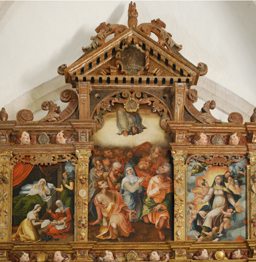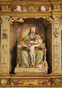 Consta el retablo de cinco calles y de tres cuerpos siendo el inferior de menor altura que el resto cuya mazonería delimita 13 encasillamientos, de los cuales uno está ocupado por la hornacina del sagrario y otro por la talla en origen dorada de una original y no muy común Trinidad con el Padre sedente – Salvator Mundi – sedente manteniendo en sus rodillas el Hijo crucificado y coronando la cruz la paloma que representa al Espíritu Santo. Por cierto que la hornacina del sagrario estuvo hasta los años 60 del siglo pasado ocupado con un sagrario renacentista posiblemente coetáneo del retablo en cuya puerta estaba representado el paño de la Verónica enmarcado por un frontón y dos columnas desaparecido misteriosamente por los años 70 que fue sustituido por otro de chapa de latón. Otra vez las nefastas modas. Un nuevo sagrario más adecuado ocupa el espacio actualmente gracias a una cesión del obispado y a las gestiones de hijos del pueblo. El encasillamiento central del cuerpo superior es más alto a modo de ático. Todo el retablo está coronado con un frontón donde aparece orlada la susodicha fecha de 1553 y la leyenda ‘Allá vamos pues allá está lo que adoramos’ de forma esquemática y abreviada. Cierran lateralmente este cuerpo dos figuras mitológicas aladas aparentemente sirenas.