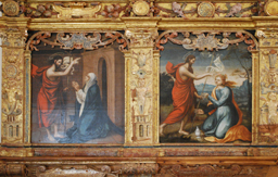 Las once casas restantes contienen las once tablas pintadas con escenas de los misterios de la religión cristiana salvo una: De arriba abajo y de izquierda a derecha, El nacimiento de la Virgen, La Ascensión de Cristo, La Coronación de la Virgen, La Anunciación, La Adoración de los pastores, La Adoración de los Reyes, La Resurrección, La Aparición de Cristo ante María, La Aparición de Cristo a María Magdalena, Aparición de Cristo a San Pedro y San Sebastián y San Fabián. Todas ellas se muestran a continuación: