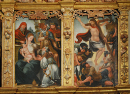 Caso curioso es la tabla derecha del cuerpo inferior que representa a San Fabián y a San Sebastián, los Santos Mártires. Es la única que no representa escenas de la vida de Cristo. Dos santos que aparentemente poco tienen que ver, uno Papa mártir bajo el mandato del emperador Decio y el otro que se hizo soldado romano para mejor poder aliviar a los cristianos y muerto asaeteado por no querer adjurar de sus creencias. Siempre hubo en Yugueros una Cofradía llamada de los Santos Mártires con rentas y propiedades, ¿pagó esta cofradía esta tabla?, ¿pagó algo más, o todo el retablo?