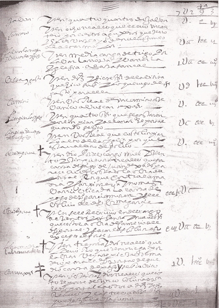 – La siguiente columna se describe la operación y su valoración en maravedís, reales o ducados y su cantidad en caso de granos en cargas, fanegas, heminas o celemines. Generalmente se inicia con la palabra ítem. Se describe el pagador y el pagado, si hay carta de pago y circunstancias del hecho que lo origina. A veces se hace referencia a presupuesto previo realizado por un tasador ya que hay cargos por este concepto.