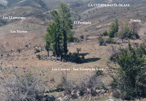 Que en el Coto Redondo hubo un poblamiento es evidente por las ruinas en la cota llamada actualmente Los Casares. Visto desde el aire aparecen terrazas que rodean el lugar casi circularmente que hipotéticamente recuerdan a un castro. Contiguo al sur del lugar y más metido en el monte, actualmente Los Campos, hay una fuente y terrazas que presumiblemente son antiguas eras y huertos. Todo esto no puede ser más que un asentamiento hoy despoblado. No hay restos de iglesia o enterramientos evidentes. Este lugar domina estratégicamente el valle de Valdeyera con el arroyo a sus pies. Sí hay enterramientos en lo que hoy llamamos la Cuesta de Santa Olaja o El Perdigón, dentro y fuera de un recinto presumiblemente una ermita en terrenos del Coto y que parcialmente alguien ha escavado. ¿Estuvo esta ermita dedicada a San Vicente, a Santa Olaja como sospechosamente se llama el lugar o a San Andrés de Yesa como pretende alguien desde Cistierna? Me inclino por Santa Olaja ya que si hubo poblado y tuvo cierta entidad, la iglesia parroquial debió estar en Los Casares y no en la cuesta del respaldo a la otra parte del valle, arroyo por medio y un desnivel de cien metros del arroyo con relación a los citados dos puntos: ermita y solar del despoblado. En los Fondos Beneficiales del Archivo del Obispado de León hay abundante información sobre el citado Beneficio y sus poseedores pero no se describe el solar donde estuvo San Vicente de Yera tal y como diré en otro apartado a ello dedicado. Otro lugar que ofrece restos de muros y la toponimia lo delata en los Murios en el canto entre los arroyos de Los Llamargos y del Perdigón. ¿Restos de casas, …cortijos para el ganado?